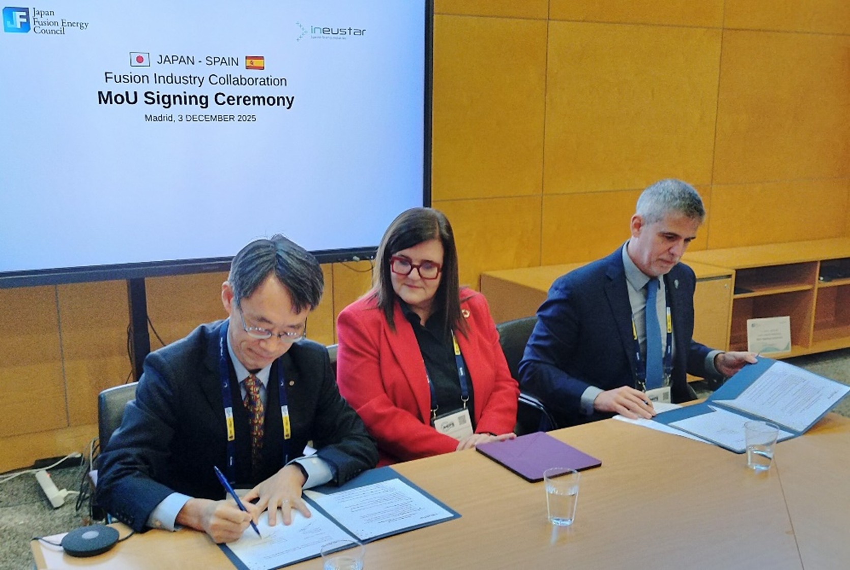 12月3日には、スペイン・マドリードにて開催されたBig Science Industry Forum Spain 2025(BSIFS2025)において、科学イノベーション大学省テレサ・リエスゴ長官(イノベーション担当)の立会のもと、J-Fusion山田安秀理事がスペイン科学産業協議会(INEUSTAR)のミゲル・カレラ会長と産業協力に関する覚書を締結しました。